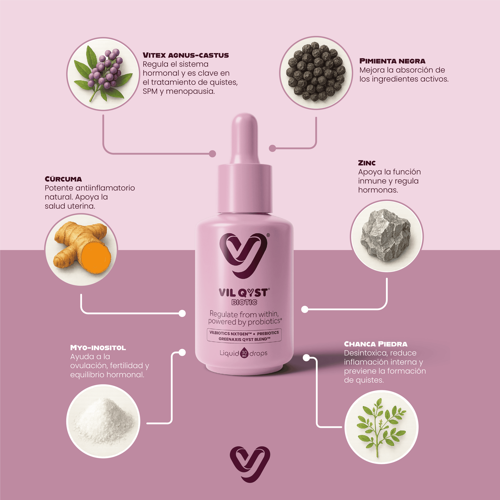 Con ingredientes naturales, VIL Qyst Byotic ayuda a tratar problemas como quistes, miomas e inflamaciones, además de regular el sistema hormonal y reproductivo, favoreciendo un ciclo menstrual equilibrado.